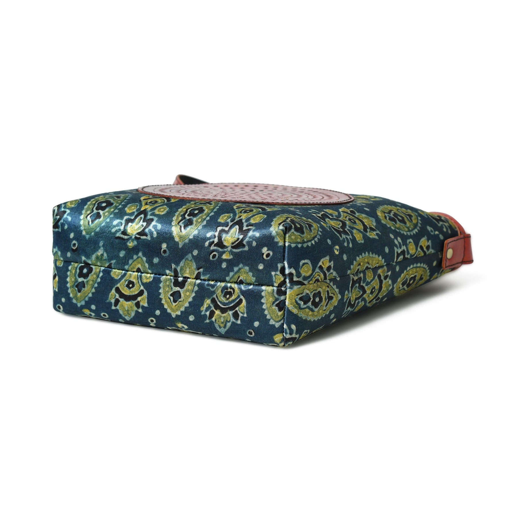 With a captivating blend of tradition and modernity, our Ajrakh Leather Tote Bag is surely a head-turner. Authentic Ajrakh motifs adorn silk fabric, framed by durable leather borders, creating an ethnic masterpiece. The circular brown leather patchwork on the front adds a unique touch.