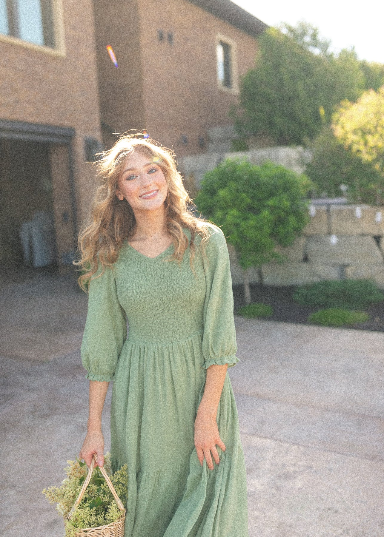 The Flora 3/4 Puff Sleeve Smocked Midi Dress is an Inherit Design crafted from 100% cotton, the same breathable and lightweight fabric as our Serena Cotton Gauze Maxi Skirt! Designed for versatility and timeless elegance, this dress features a modest v-neckline, 3/4 puff sleeves, and a smocked bodice that offers both structure and comfort. The soft cotton fabric drapes beautifully, creating a flowy silhouette perfect for any occasion. With its midi length and flattering fit, this dress is ideal for church, family gatherings, or everyday wear!