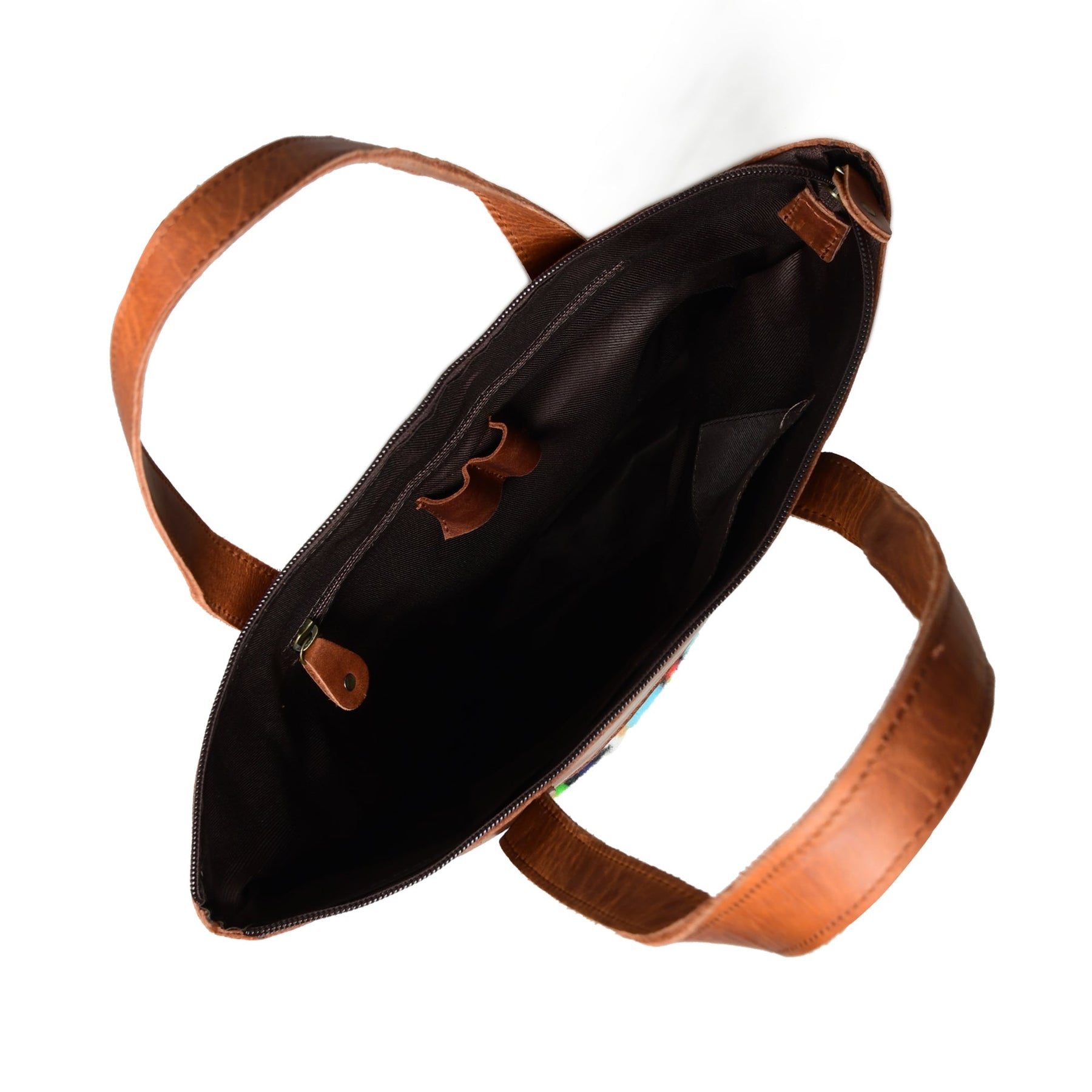 Discover unique style with our Multicolored Leather Tote Bag. Crafted from robust buffalo leather, it features a contrasting multicolored patch of woven textured fabric on brown leather, creating an eye-catching design. The multicolored fabric adds a Bohemian touch to the shoulder tote bag.