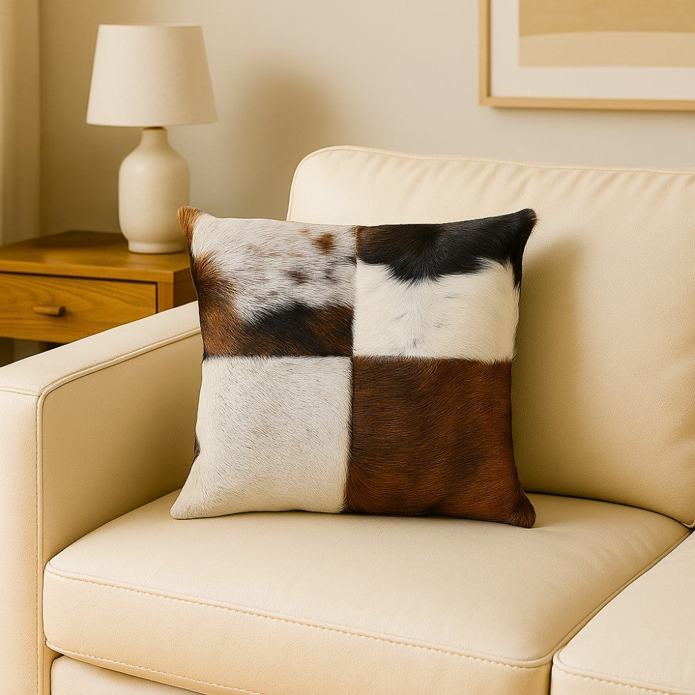 This handcrafted cowhide pillow is made from premium hair-on-hide panels. The four-panel patchwork layout creates natural contrast and texture on both sides. Choose between the Patches style, featuring rich multi-tone variation, or Solid, for a smoother and more even look. Every pillow is completely unique and adds rustic warmth and natural texture to any interior.