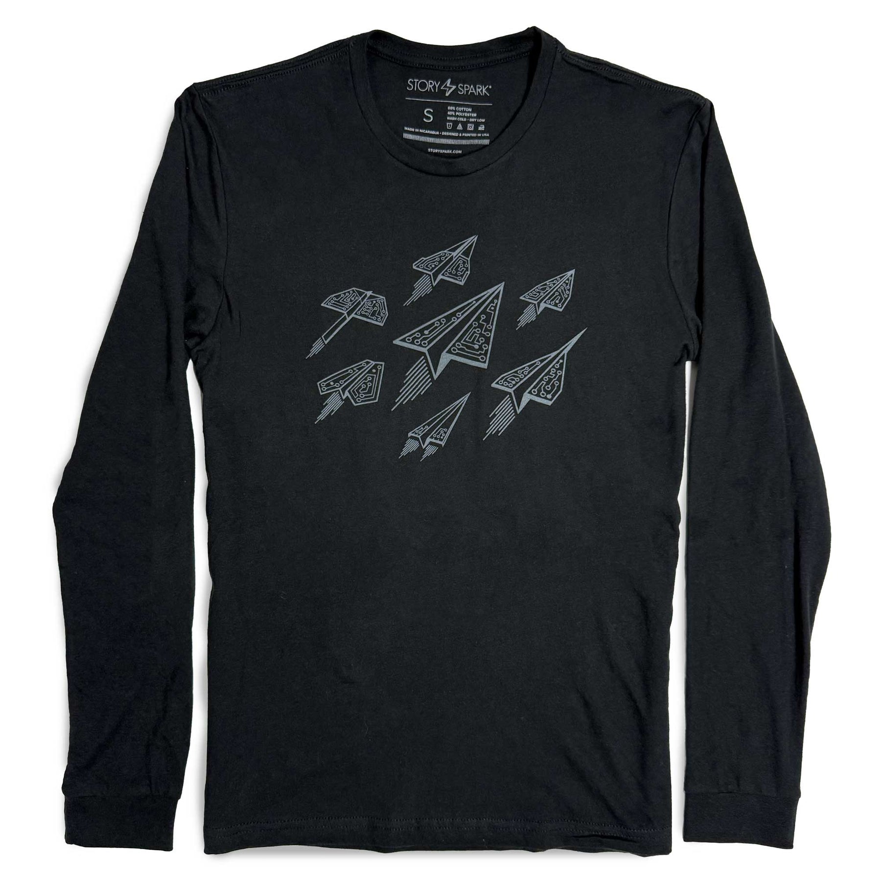 At STORY SPARK, we take great pride in creating unique illustrations on soft, lightweight graphic tees that allow you to tell a story and spark connections wherever you go. Make this techy paper airplane long-sleeve t-shirt part of your story, and see what conversations you can inspire.