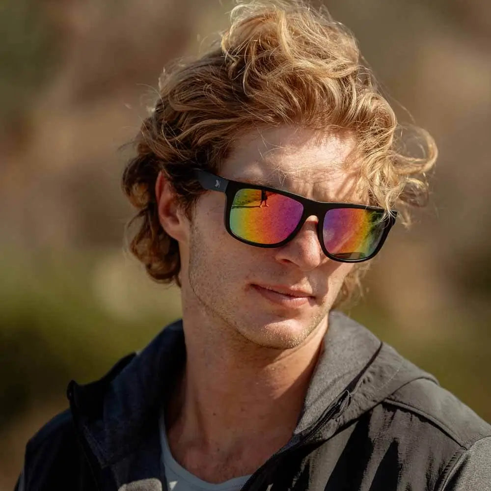 Pop on a pair of our Rainbow on Black Torrey Pines sunglasses and invest in the perfect balance of flashy and bold. You’ll have the best of both worlds thanks to a neutral, matte black frame that lends a more reserved vibe to the equation. Gunmetal ‘K’ logos add another level of casual style that’s offset with polarized rainbow lenses that reveal your vibrant inner glow. What can we say? You’re all set for the adventures ahead.