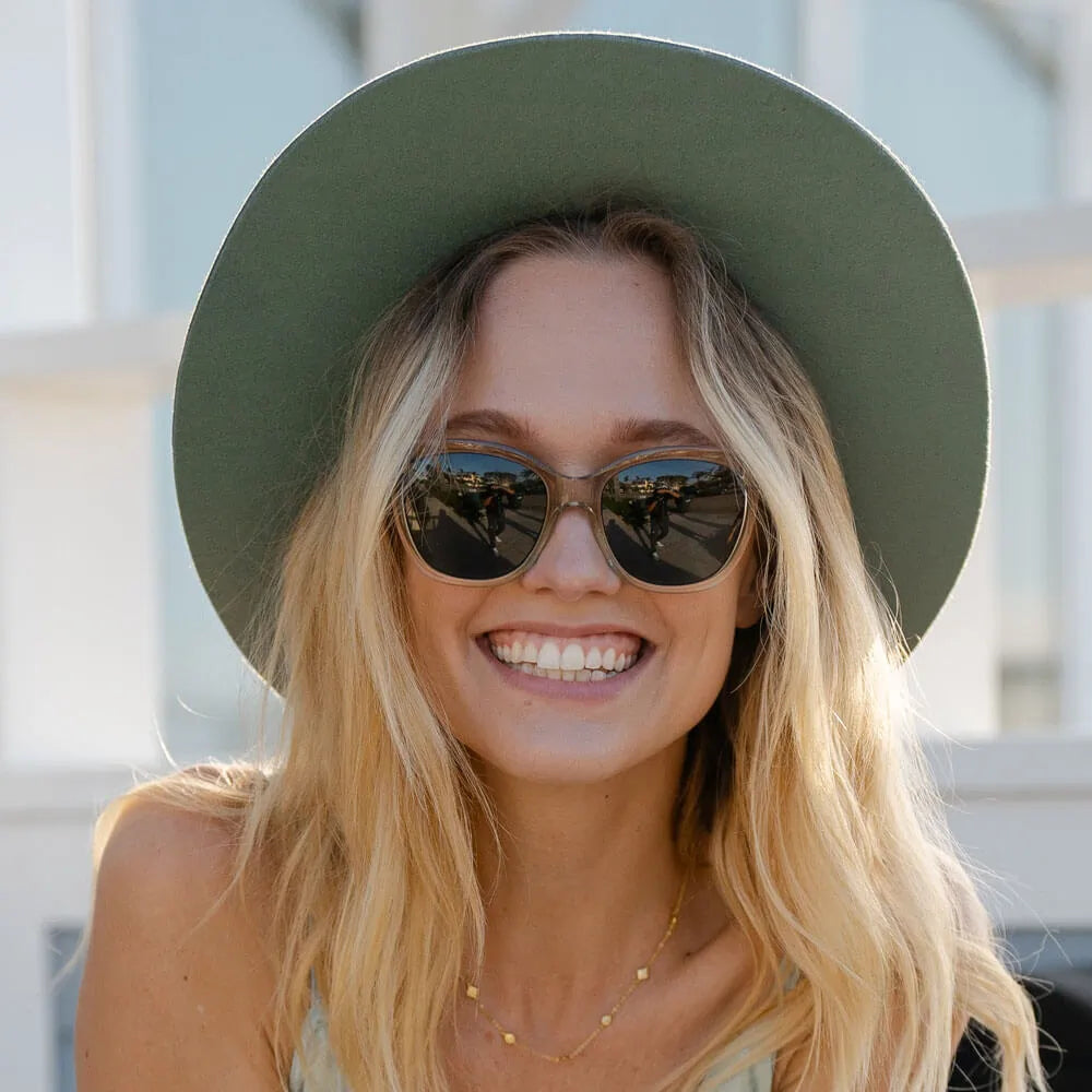 Next time you hear adventure calling your name, reach for our Sandbar Deja Views. These oversized, cat eye sunglasses are perfect for hiking and brunching alike, not to mention the combo of silver ‘K’ detailing and transparent tan frames for an ultra-smooth execution. The whole look is topped off with polarized aviator green lenses that feature UV400 protection and impact resistance for a world of possibilities.